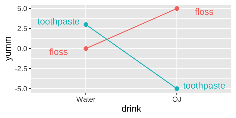 This is an extreme case. More broadly, an interaction is any case in which the slope of two lines differ – that is to say when the effect of one variable on an outcome depends on the value of another variable.