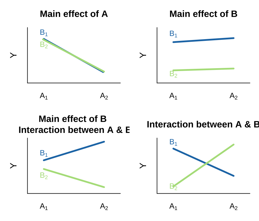 - We can see an effect of only variable A on Y. That is, lines can have nonzero slopes (“Main effect of A”).