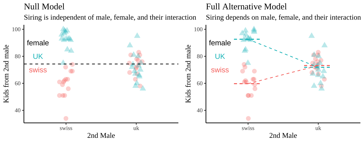 - \(H_0:\) The influence of male origin on siring success does not differ by female origin.