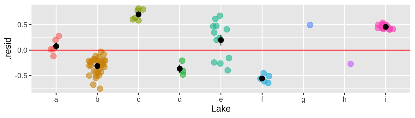 That would be a big mistake – as each fish is not independent. There could be something else about the lake associated with levels of Selenium in fish that is not in our model. This seems likely, as we see below, that residuals differ substantially by lake.