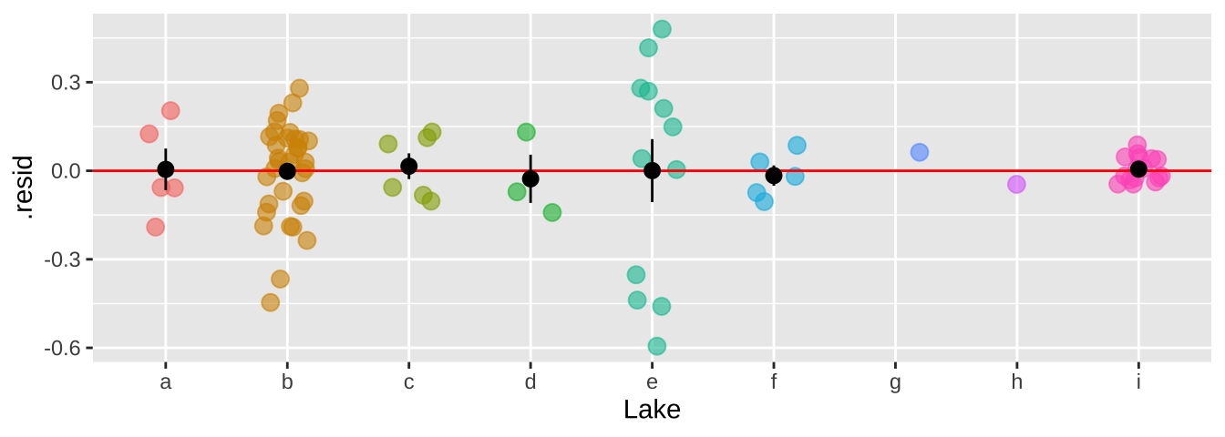 We can now see that by modeling Lake as a random effect, the residuals are now independent.