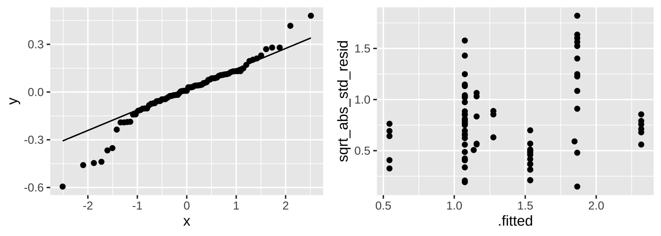 Let’s look into the last two for these data. Because we hate autoplot, and it can’t handle random effects output, let’s make out own diagnostic plots.