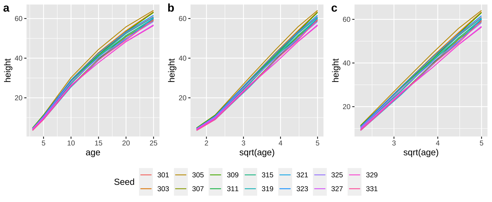 b <- ggplot(Loblolly, aes(x = sqrt(age), y = height, group = Seed, color = Seed))+ geom_line()