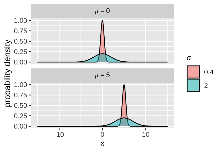 Each normal distribution is fully characterized by two parameters – a mean \(\mu\), and variance \(\sigma^2\) (or standard deviation, \(\sigma\)). I show four different normal distributions – all combinations of \(\mu =0\) or \(\mu = 5\), and \(\sigma = 2\) or \(\sigma = .2\) to the right.