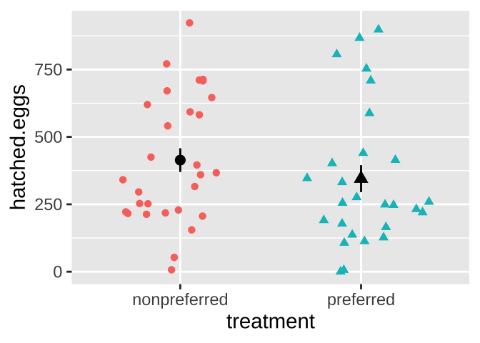 Figure 17.3: No evidence that the number of hatched eggs differed in nonpreferred vs preferred matings (two-tailed permutation based p-value = 0.30). Emojis show raw data, points show groups means, and lines display bootstrapped 95% confidence intervals.