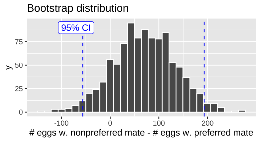 To test the idea that mating with preferred partners increased reproductive output, we analyzed data from wood frogs (Rana sylvatica). In this experiment, Swierk and Langkilde (2019), identified frogs’ preferred partners, randomly assigned some frogs preferred and other non-preferred partners, and counted the number of hatched eggs in each group. These data, presented in Figure 17.3, show that slightly fewer eggs hatched from preferred (mean = 345, HERE bootstrapped 95% CI = {254, 444}) than non nonpreferred couples (mean = 414, bootstrapped 95% CI = {254, 444}), but there was large variability within each couple (\(sd_\text{preferred} = 260\), \(sd_\text{nonpreferred} = 237\)). This small difference in means was not significant (two-tailed permutation-based p-value = 0.30) – as such we cannot reject the null hypothesis and conclude that there is no evidence to suggest that preferred and nonpreferred woodfrog couples hatch different numbers of eggs.