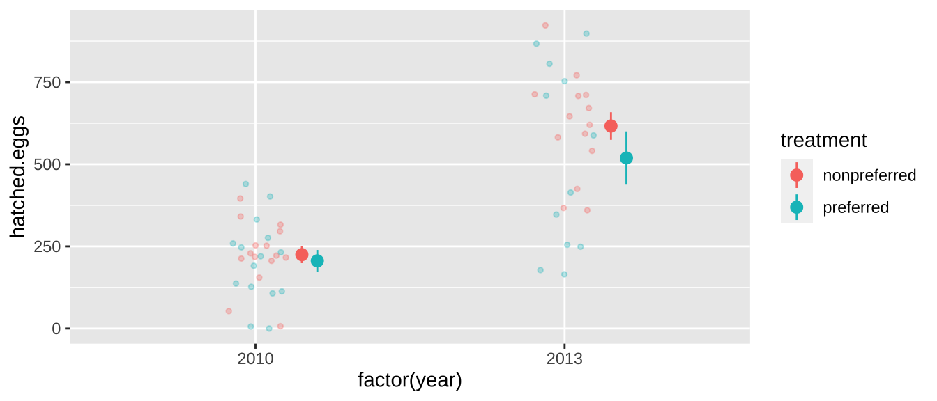 ggplot(aes(x= factor(year), y = hatched.eggs, color = treatment)) +