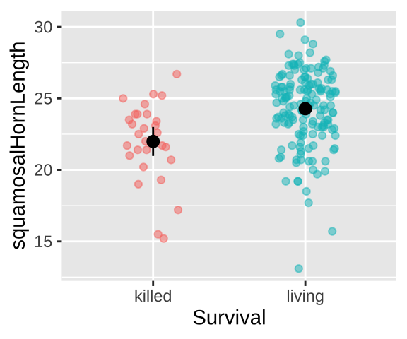 Summarizing the difference in Killed and Living lizards: So, surviving lizards have horns that are 2.29 longer than killed lizards.
