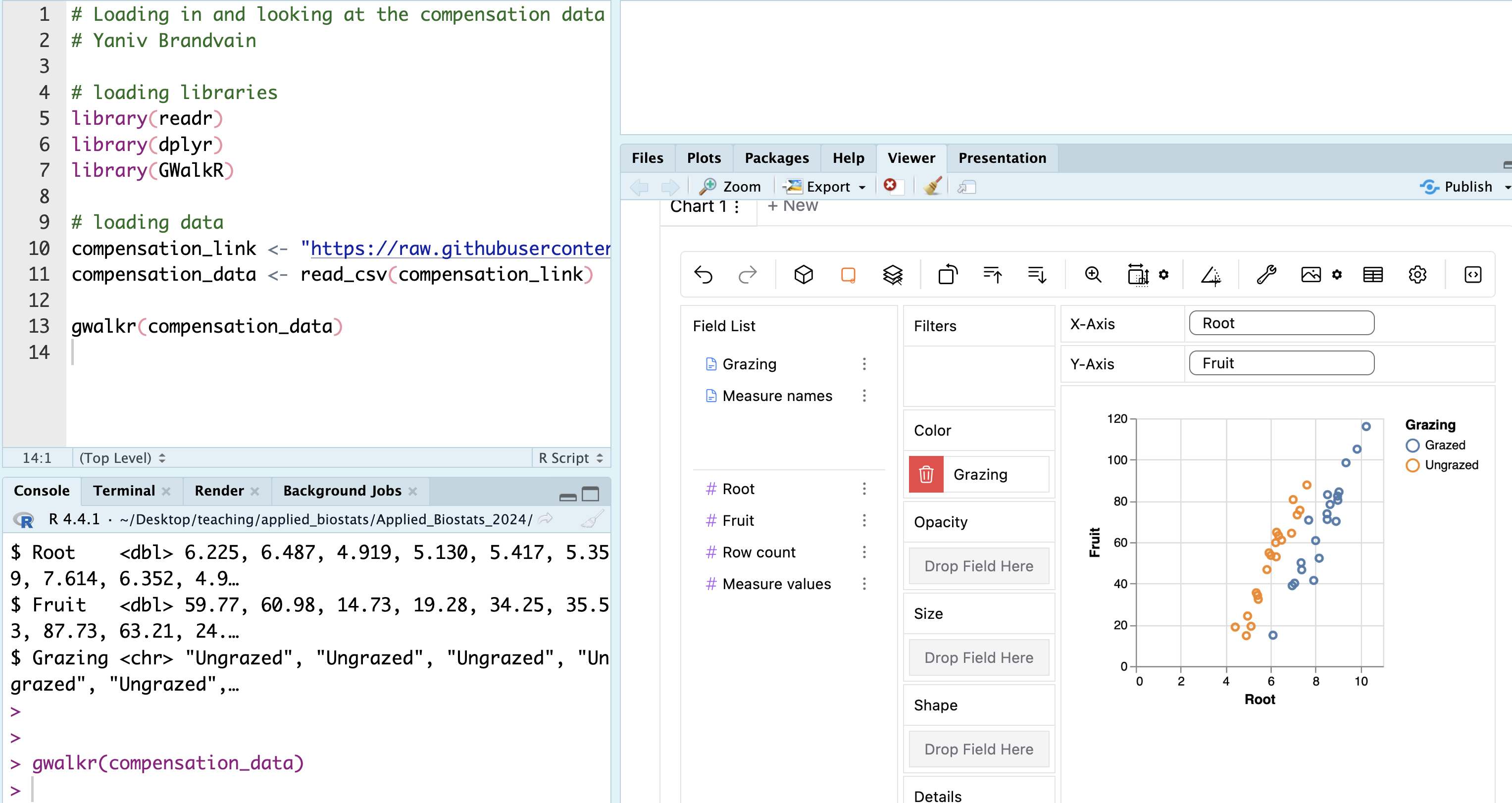 Another very important way to look at your data is to plot it! This is always the first step in a data analysis in that it helps us understand our data and scan for outliers. Later we will learn how to use the ggplot2 package in R to make high-quality and reproducible plots. But that is not our goal today. Today we hope to quickly explore our data with minimal coding skill. To do so we will use the gwalkr() function in the GWalkR package to bring up a simple GUI to explore our data. Remember to install the GWalkR package the first time you use it, and load the library every time you restart R.