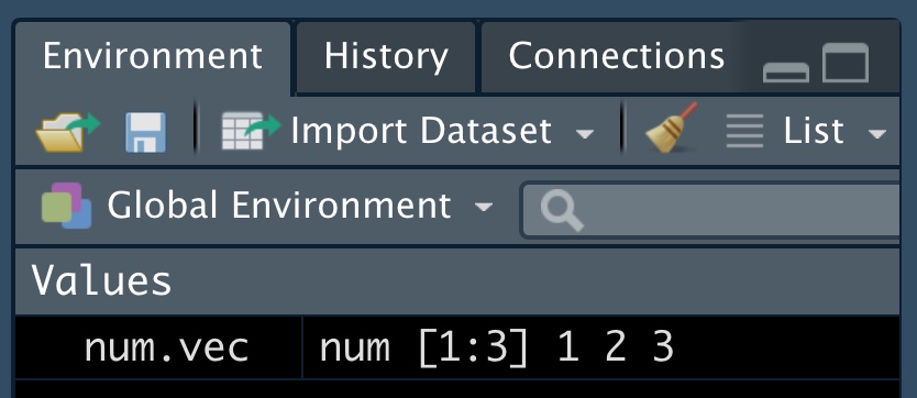 With these variables assigned, we can do simple math, ask logical questions , use them as arguments for functions. For example sqrt(x = num_vec) returns 2, 3, 4. All variables assigned should be in your environment window (see below).