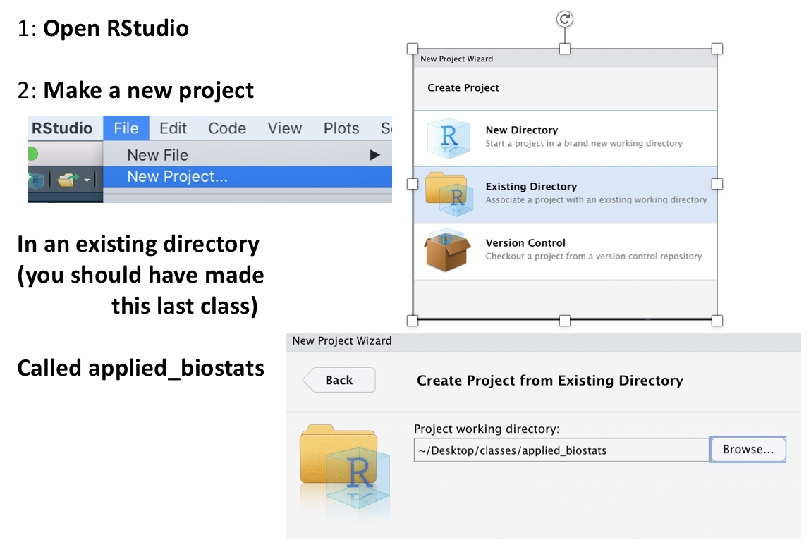 We aren’t always lucky enough to have data on the internet. In fact when we are conducting our own science, we save data onto our computer. This makes finding the data and directing R to it somewhat difficult. Although there are may ways to do this, I find that making a project and having simple and consistent folder organization make this easiest. In general, I make a new Rproject, for each new research project. In this course, you might want to make one R project for standard classwork and standard homework, and distinct Rprojects for your more involved evaluations. But see what works best for you. To get started