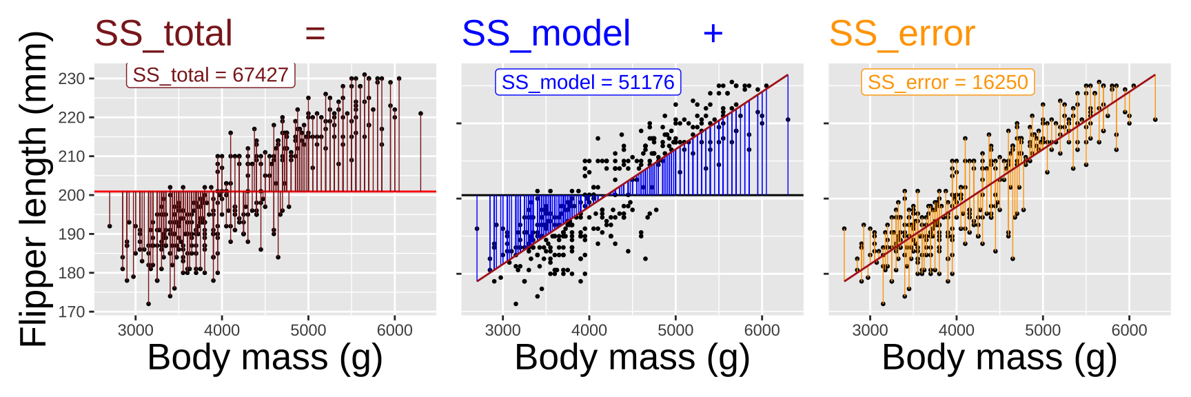 `sum(SSmodel)/sum(SStot)` `cor(body_mass_g, flipper_length_mm)^2`