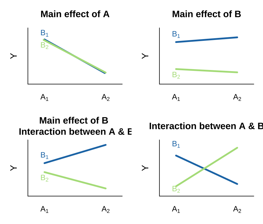 This is an extreme case. More broadly, an interaction is any case in which the slope of two lines differ – that is to say when the effect of one variable on an outcome depends on the value of another variable.