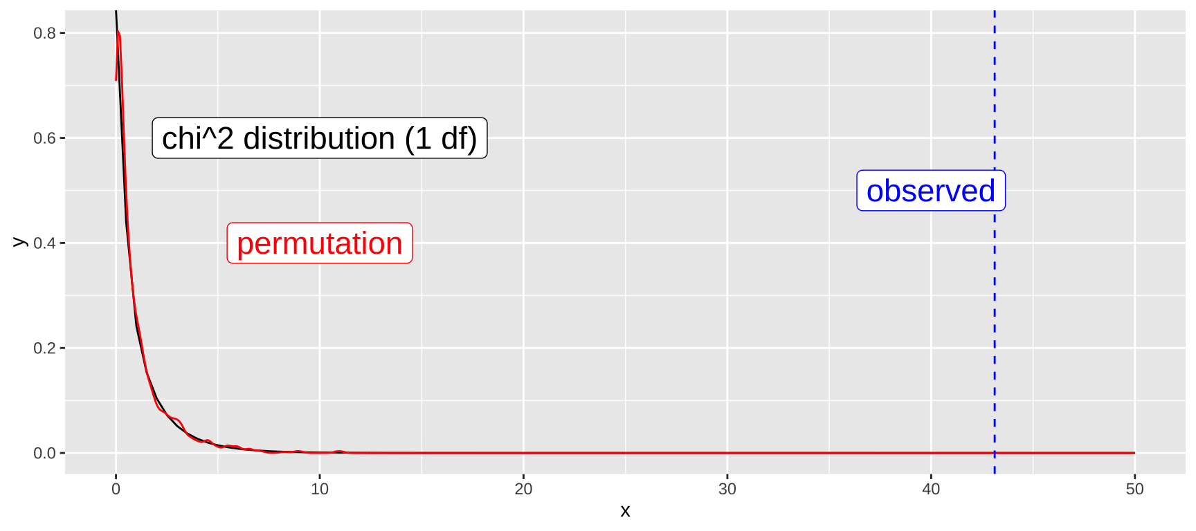 label = c("chi^2 distribution (1 df)", "permutation", "observed"), size = 6)