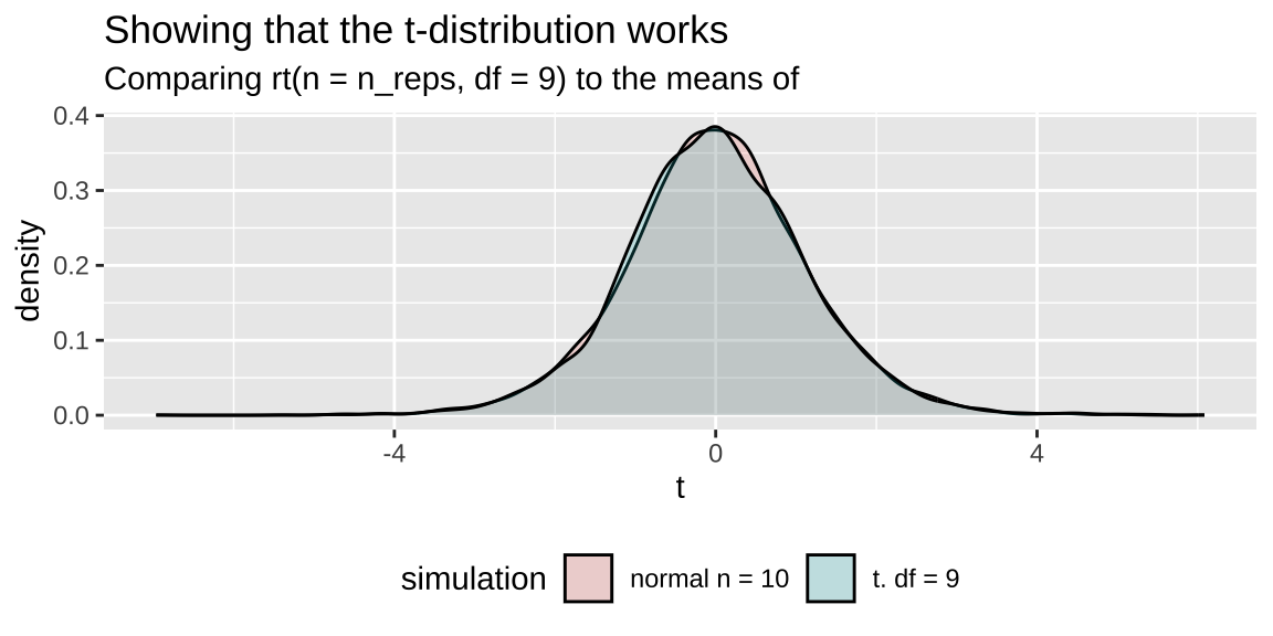 subtitle = "Comparing rt(n = n_reps, df = 9) to the means of ")