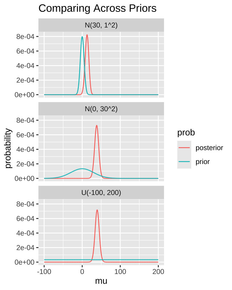 A good practice is to compare posterior distributions across different prior models. The plot below shows that if our prior is very restrictive, it can be difficult to shift the posterior away from it. In other words, if your prior belief is strong, it will take a lot of evidence to change it.