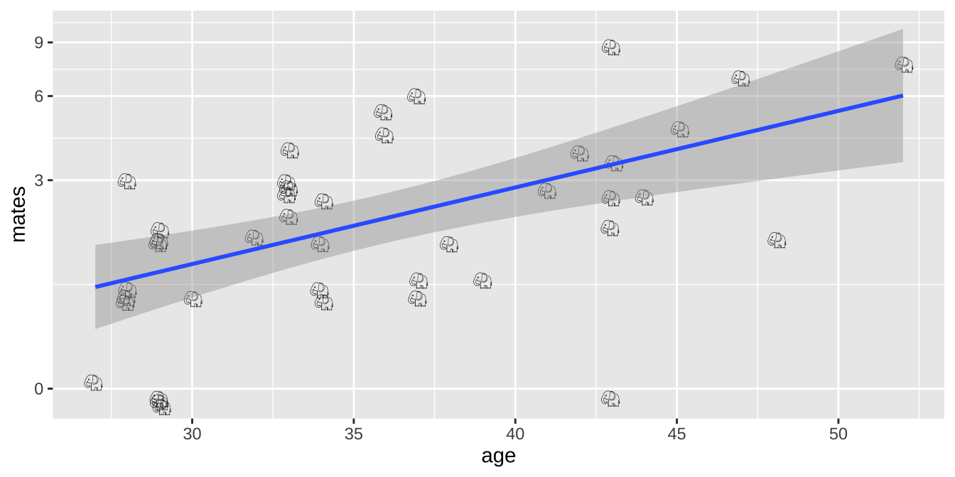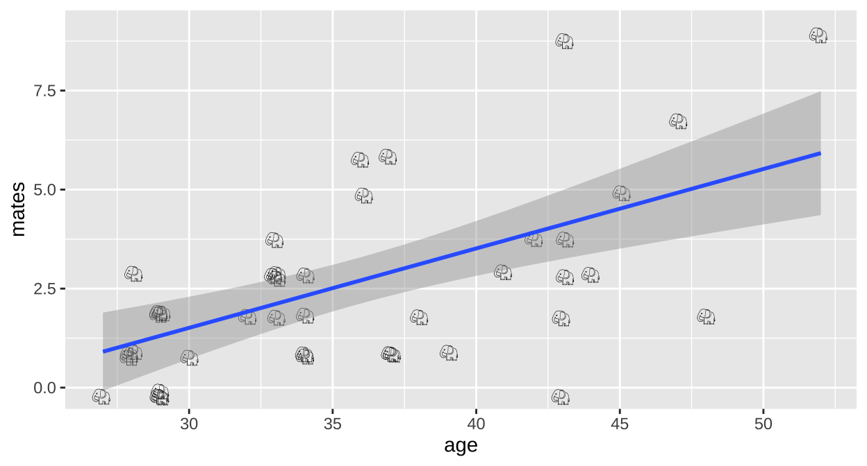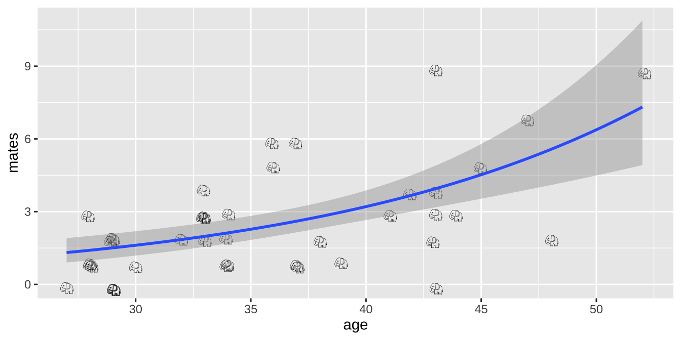So for our linear predictor, we begin with an intercept of -1.582 and add 0.06869 for every year an elephant has lived. So for a 40 year old elephant, the linear predictor, \(Y_{age = 40} = -1.582 + 40 \times 0.06869 = 1.1656\). Exponentiating this (to convert from log to linear scale), we predict that a 40 year old elephant male, will have, on average \(e^{1.1656} = 3.2\) mates (in R exp(1.1656)), with Poisson distributed error.