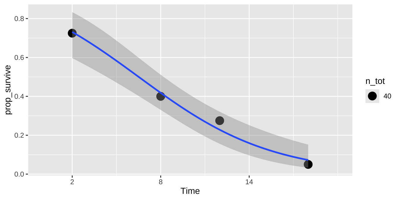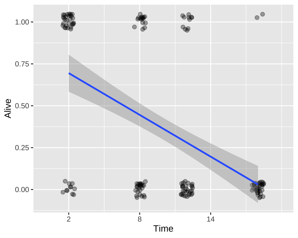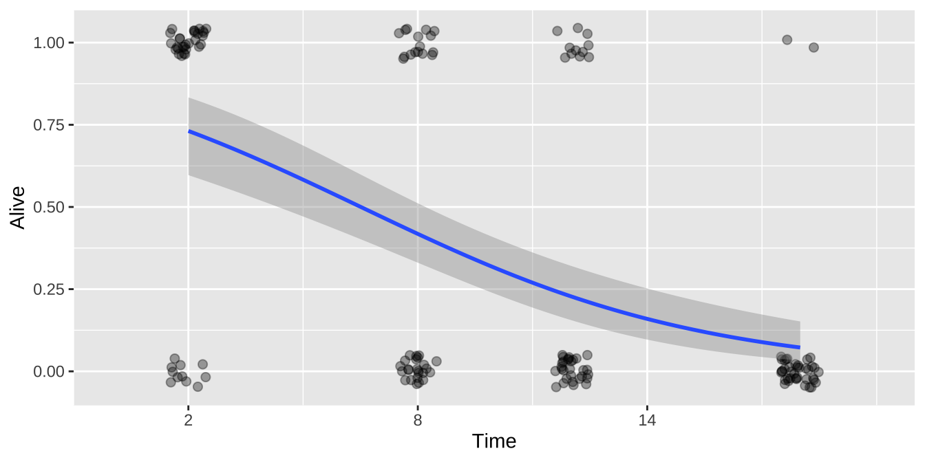 ggplot(cold.fish, aes(x = Time, y = Alive)) +