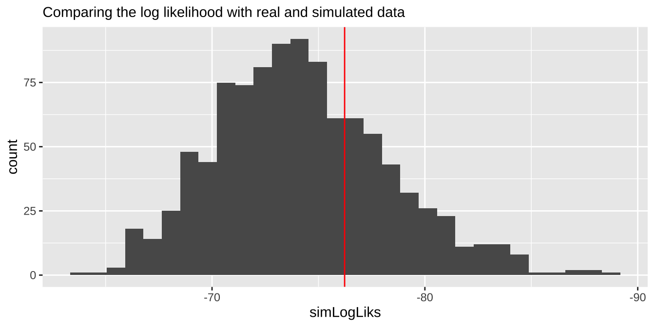 If we did a bunch of these simulations and our log likelihood way further from zero than nearly all simulated cases, we’d worry about model fit. The histogram below suggests