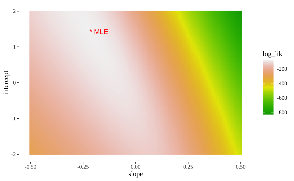 geom_text(data = . %>% top_n(log_lik, n=1), aes(label = "* MLE"),