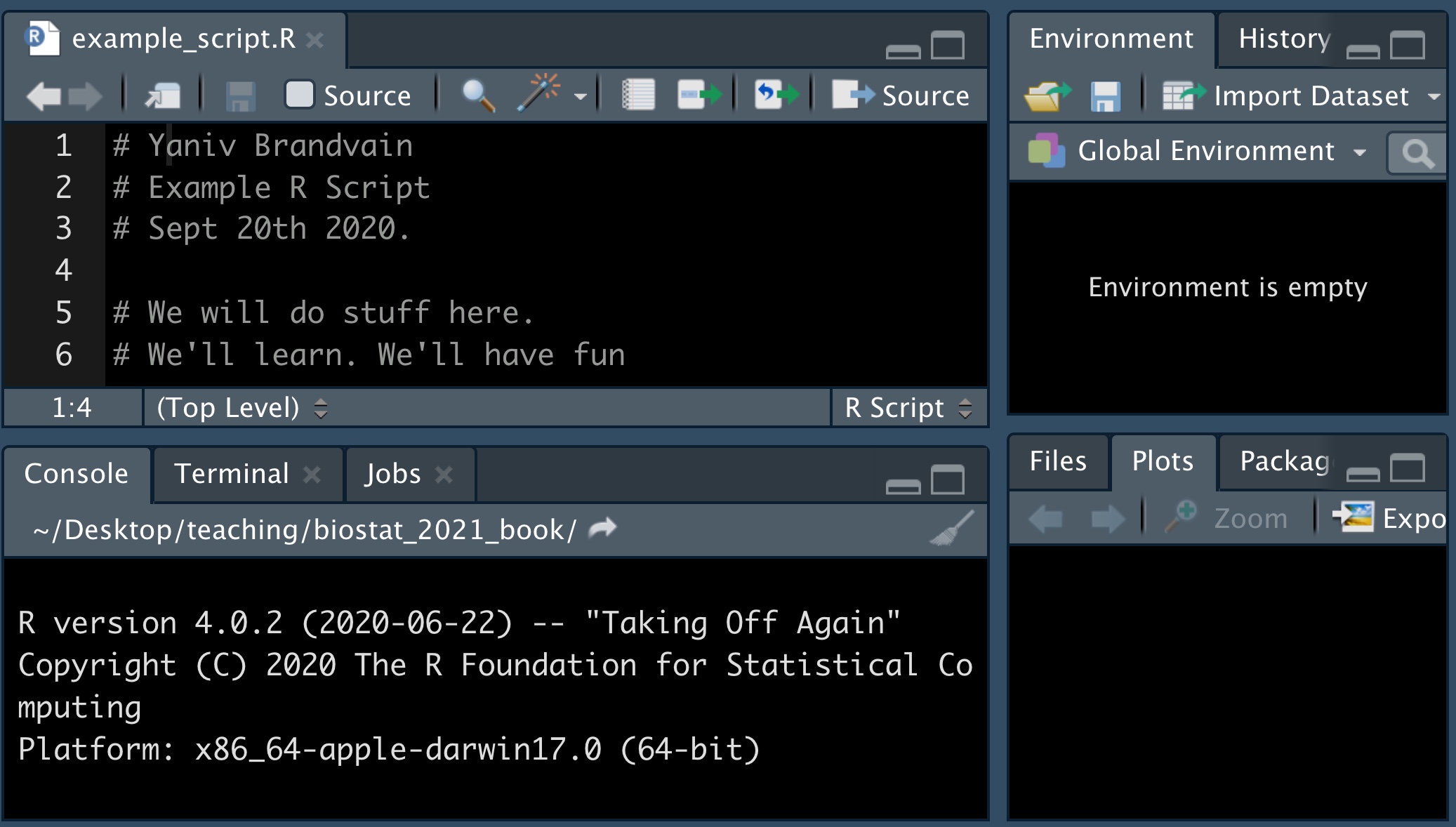 one <- 1Now R knows that my_name is yaniv brandvain . Notice I put my name in quotes to tell R that we are dealing with a word (or character), a not around my_name because my_name and one are variables, and ” is a character, and not a variable in R) and the “yaniv brandvain” is a character. On the other hand, there is no need to wrap quotes around numbers (unless you want R to think the number is a character).