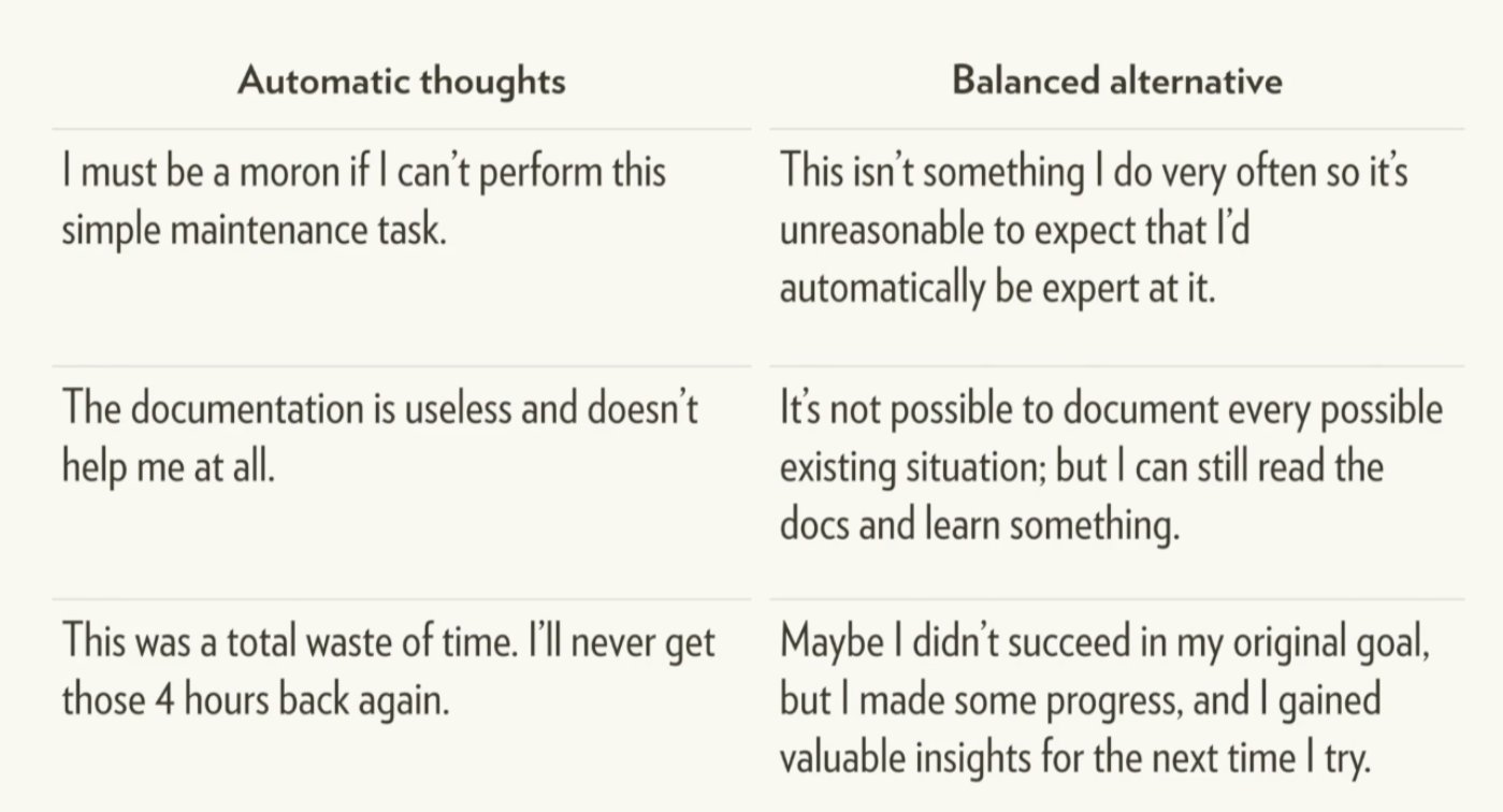 At last year’s RStudio conference, Hadley Whickham, conrasted the “automatic negative thoughts” we feel some time in coding to the “balanced alternative” that we want to get to.