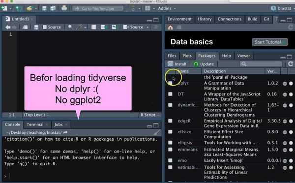 You should see messages like I did upon loading the tidyverse library. You should also see in the Packages tab, that you now have a check next to dplyr, forcats, ggplot2, purrr, readr tibble, and tidyr, as these are all loaded with tidyverse.