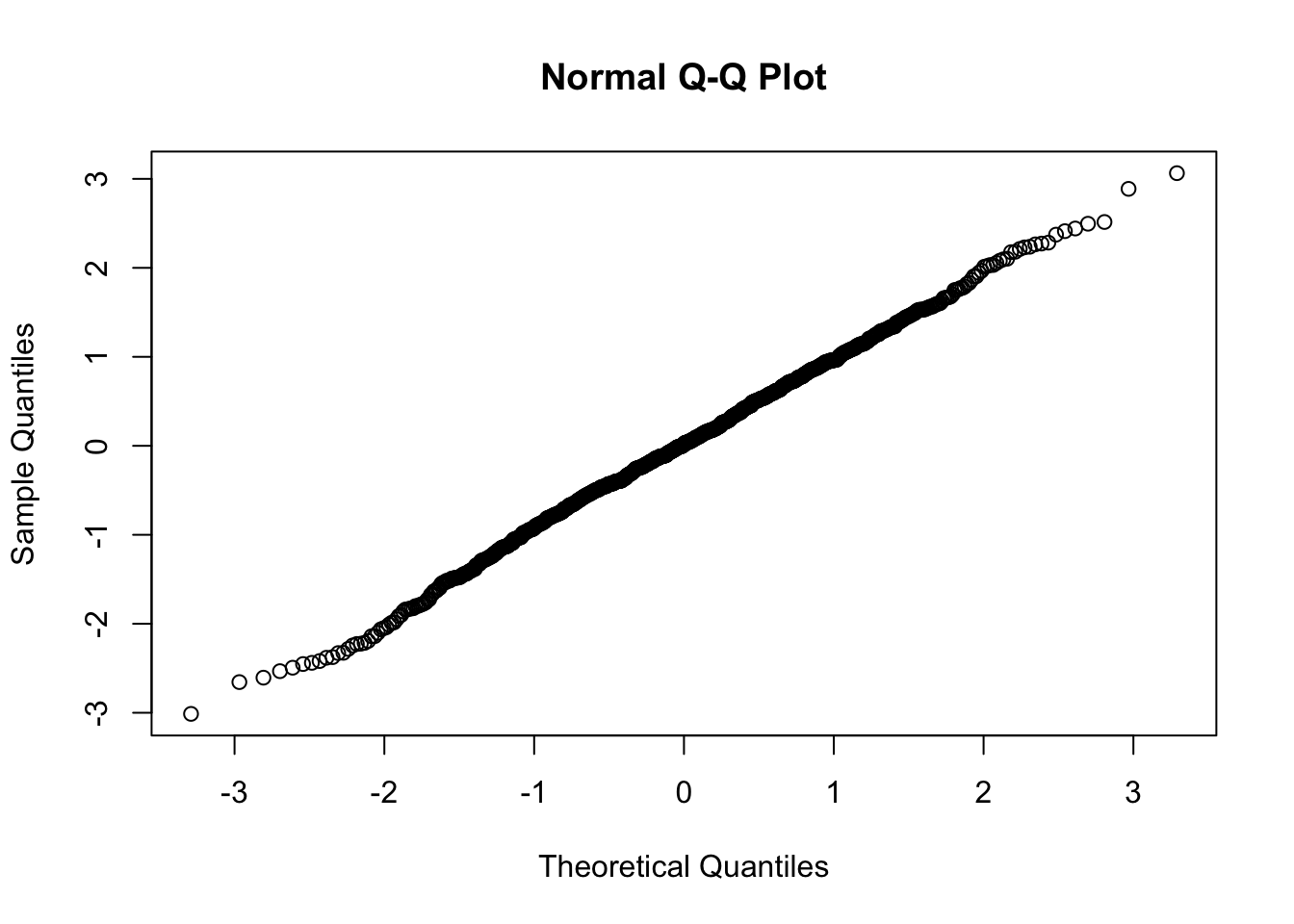 A Q-Q plot is a scatterplot created by plotting two sets of quantiles against one another. If both sets of quantiles came from the same distribution, we should see the points forming a line that’s roughly straight. Here’s an example of a Normal Q-Q plot when both sets of quantiles truly come from Normal distributions.