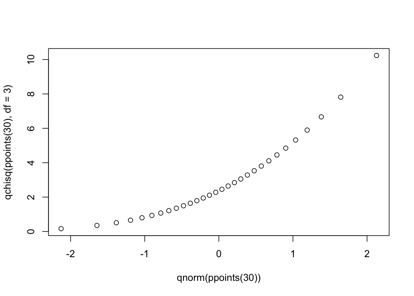 qqplot(qnorm(ppoints(30)), qchisq(ppoints(30),df=3))