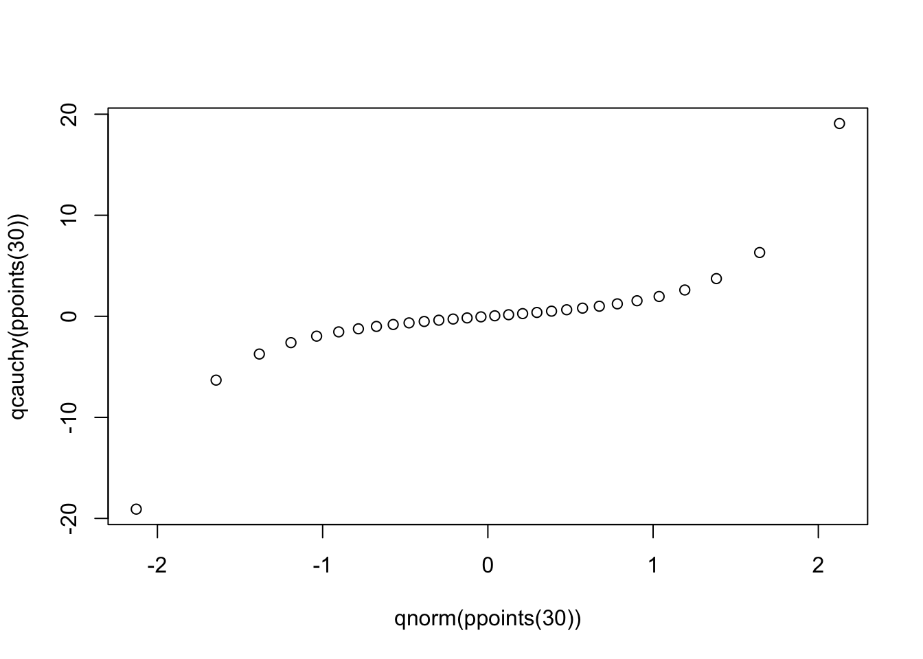 qqplot(qnorm(ppoints(30)), qcauchy(ppoints(30)))