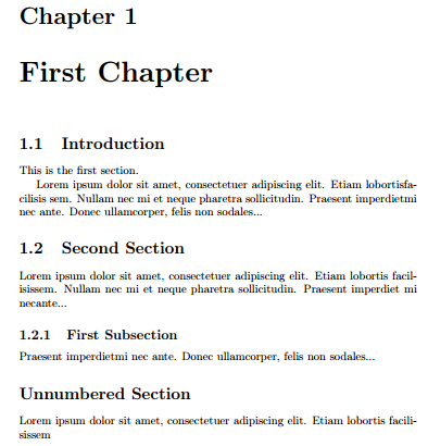 The command \section{} marks the beginning of a new section, inside the braces is set the title. Section numbering is automatic and can be disabled by including a * in the section command as \section*{}. We can also have \subsection{}s, and indeed \subsubsection{}s. Note that \part and \chapter are only available in report and book document classes.