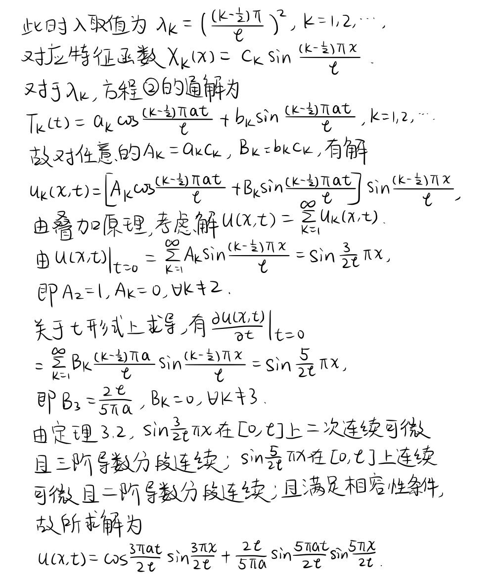 此处我们直接阐述变量分离法的基本思想与求解方法, 以波动方程为例. 考虑方程 \[\left\{\begin{array}{ll} u_{tt}-a^{2} u_{x x}=0, & 0<x<l, t>0 \\ \left.u\right|_{t=0}=\varphi(x),\left.u_t\right|_{t=0}=\psi(x), & 0 \le x \le l \\ \left.u_{x}\right|_{x=0}=0,\left.\quad u_{x}\right|_{x=l}=0, & t\ge0 \end{array}\right.\tag{3.1}\] 若假设方程具有变量分离形式\(u(x,t)=X(x)T(t)\)形式的特解, 则应当满足 \[\frac{X^{\prime \prime}(x)}{X(x)}=\frac{1}{a^{2}} \frac{T^{\prime \prime}(t)}{T(t)}=-\lambda\tag{3.2}\] 其中\(\lambda\)为常数. 对于非零解有\(T(t)\neq0\), 则得到子问题 \[\left\{\begin{array}{l} X^{\prime \prime}(x)+\lambda X(x)=0 \\ X(0)=X(l)=0 \end{array}\right.\tag{3.3}\] 进一步分析可得到, 若要得到非平凡解, 则仅当\(\lambda>0\)时才可取得. 此时我们将问题\((3.3)\)解得的特征根\(\{\lambda_k\}\)构造满足\(\lambda=\lambda_k\)时式子\((3.2)\)确定的函数\(X\)和\(T\), 进而解出一个解\(u_k(x,t)=X_k(x)T_k(t)\). 再考虑当解取 \[u(x,t)=\sum_{k=1}^\infty u_k(x,t)\]时确定各\(u_k(x,t)\)中的待定参数, 便可以得到形式上的解, 再通过验证一致收敛性表明此时得到的解即为原问题的解, 因而成功进行求解.