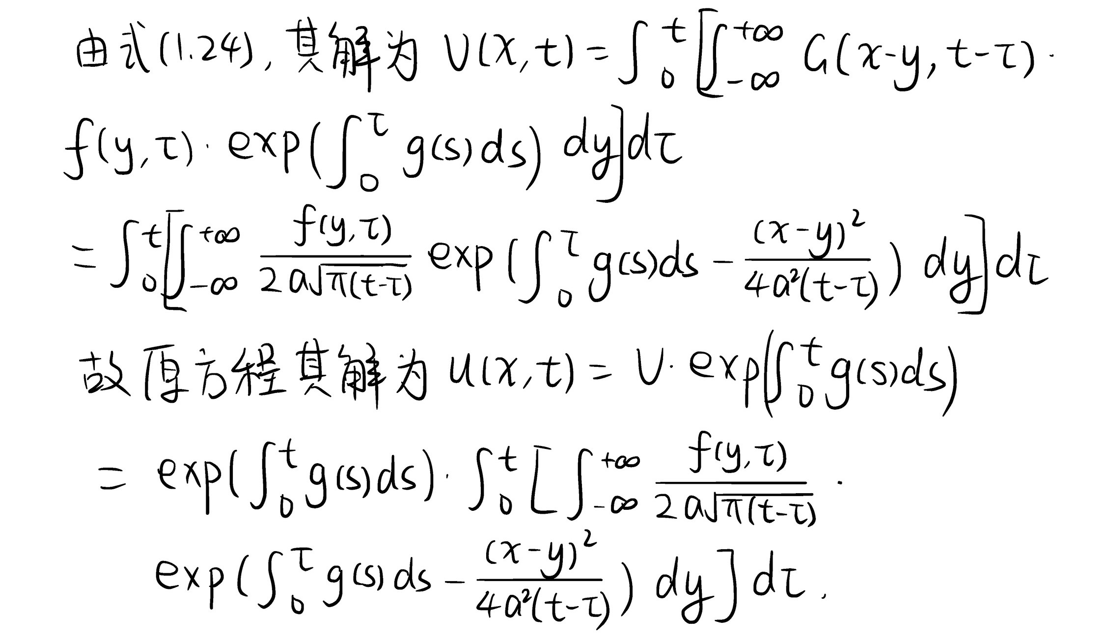该公式称为Poisson公式, 其中函数\(G(x,t)\)称为热核函数. 对于非齐次的情形, 我们可以通过Duhamel原理进行求解. 下面我们给出一道习题加深理解. 在这一题中, 巧妙地使用了一个变换, 消去了原始方程中等式右侧的变量\(g(t)u\), 转化为可以使用Duhamel原理进行求解的形式, 虽然方法不唯一, 但是在这一方法中, 该变换是十分重要的.