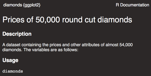 Here, we see that there are 10 total variables (three ordered factors, one integer, and 6 numeric). An added bonus of working with a built-in dataset is that documentation giving further descriptions and explanations is available via the help page (?diamonds).
