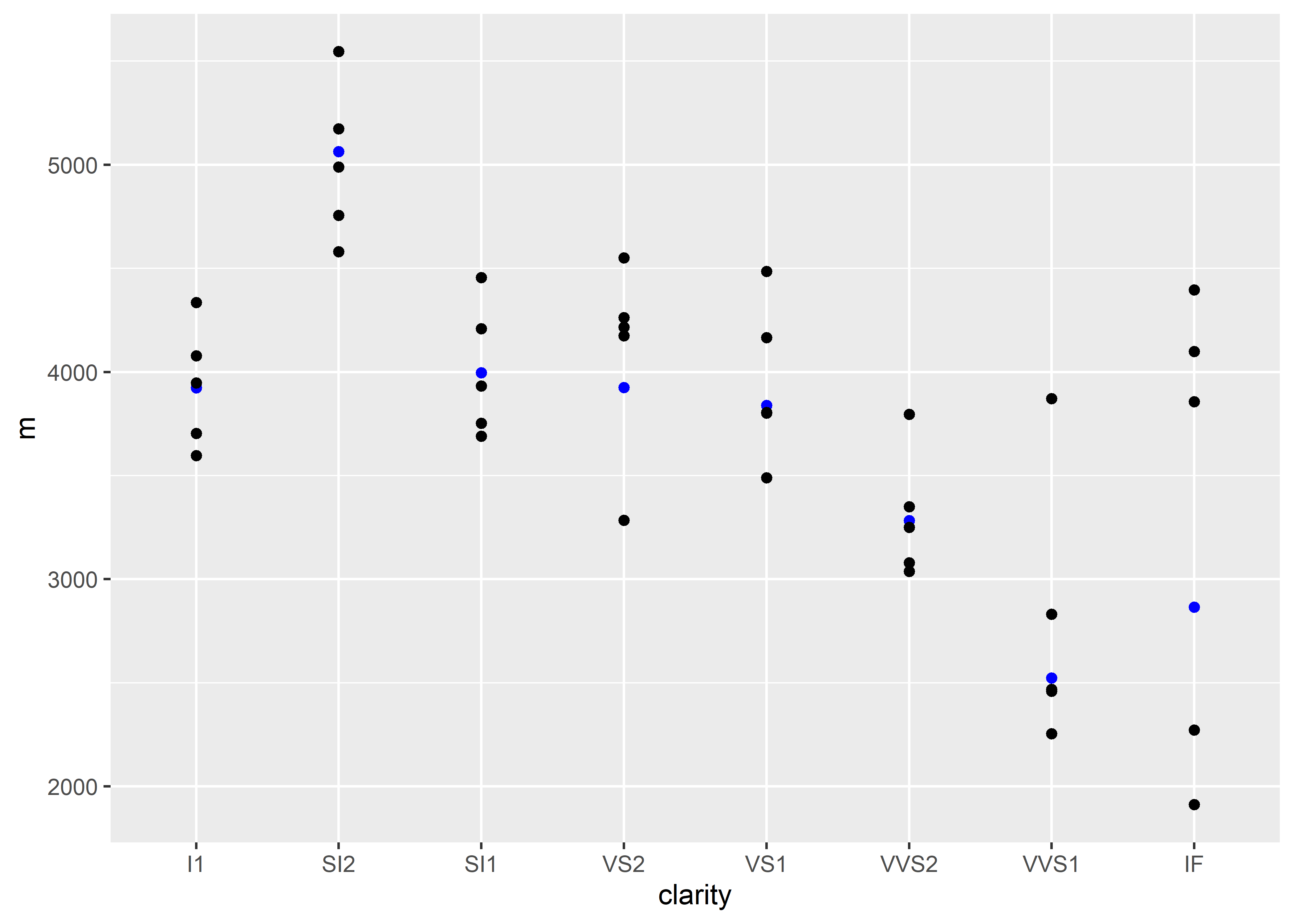 geom_point(data = data1, aes(x = clarity, y = m), color = "blue") + # must include argument label "data"