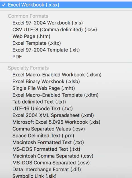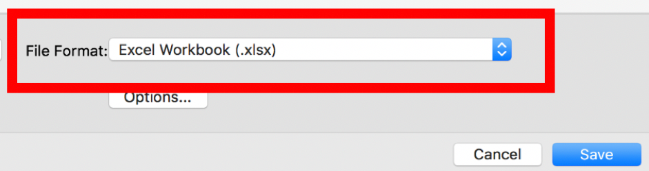 To import your dataset, you must make sure that the data file is within the same folder as your R project (explained in earlier sections). Next, you need to determine the file format. Is your file an .xlsx (standard Excel file) or .csv (Comma Separated Values) file? The file format is determined by how you save the spreadsheet when you click Save As.