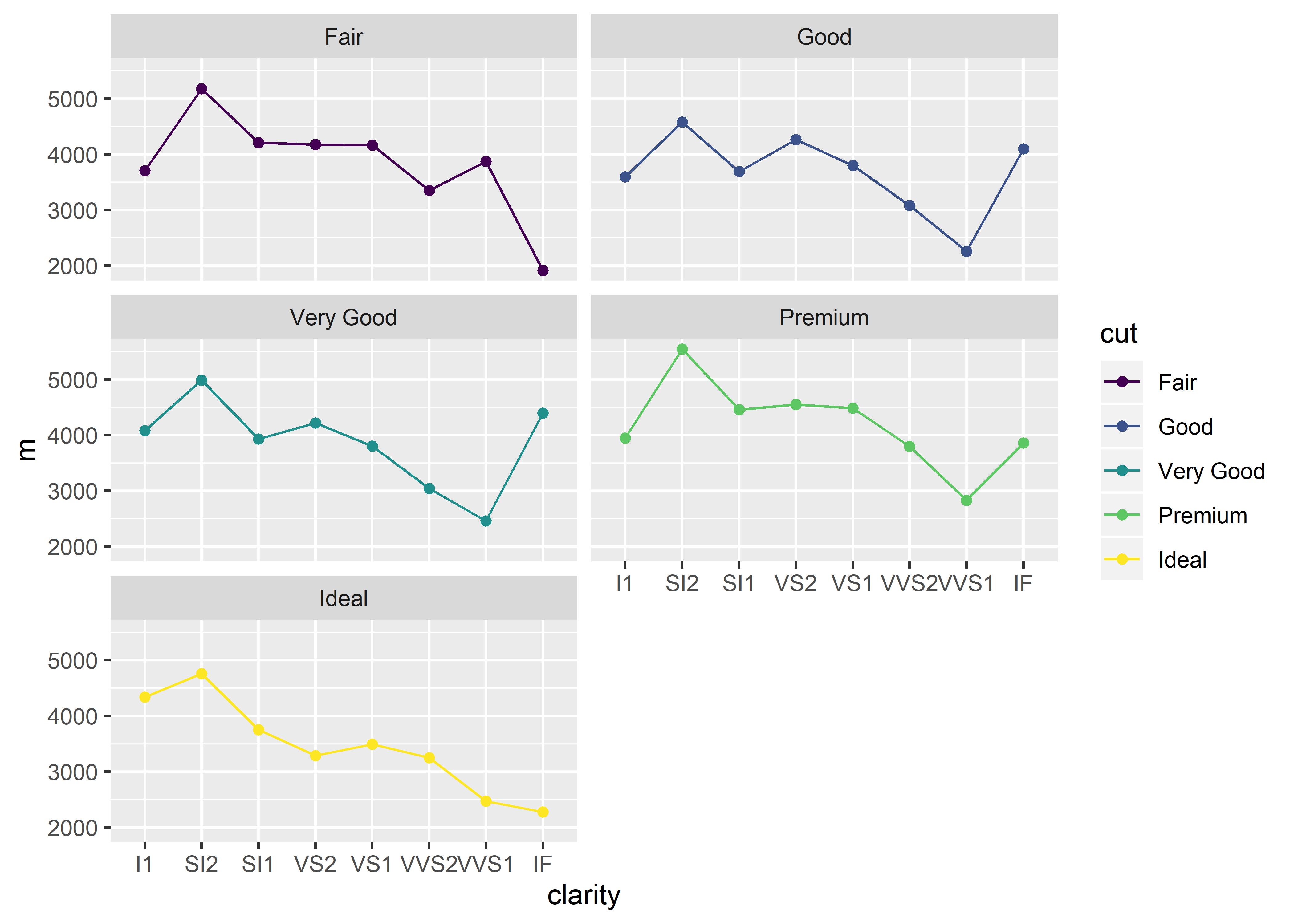 ggplot(aes(x = clarity, y = m, group = cut, color = cut)) +