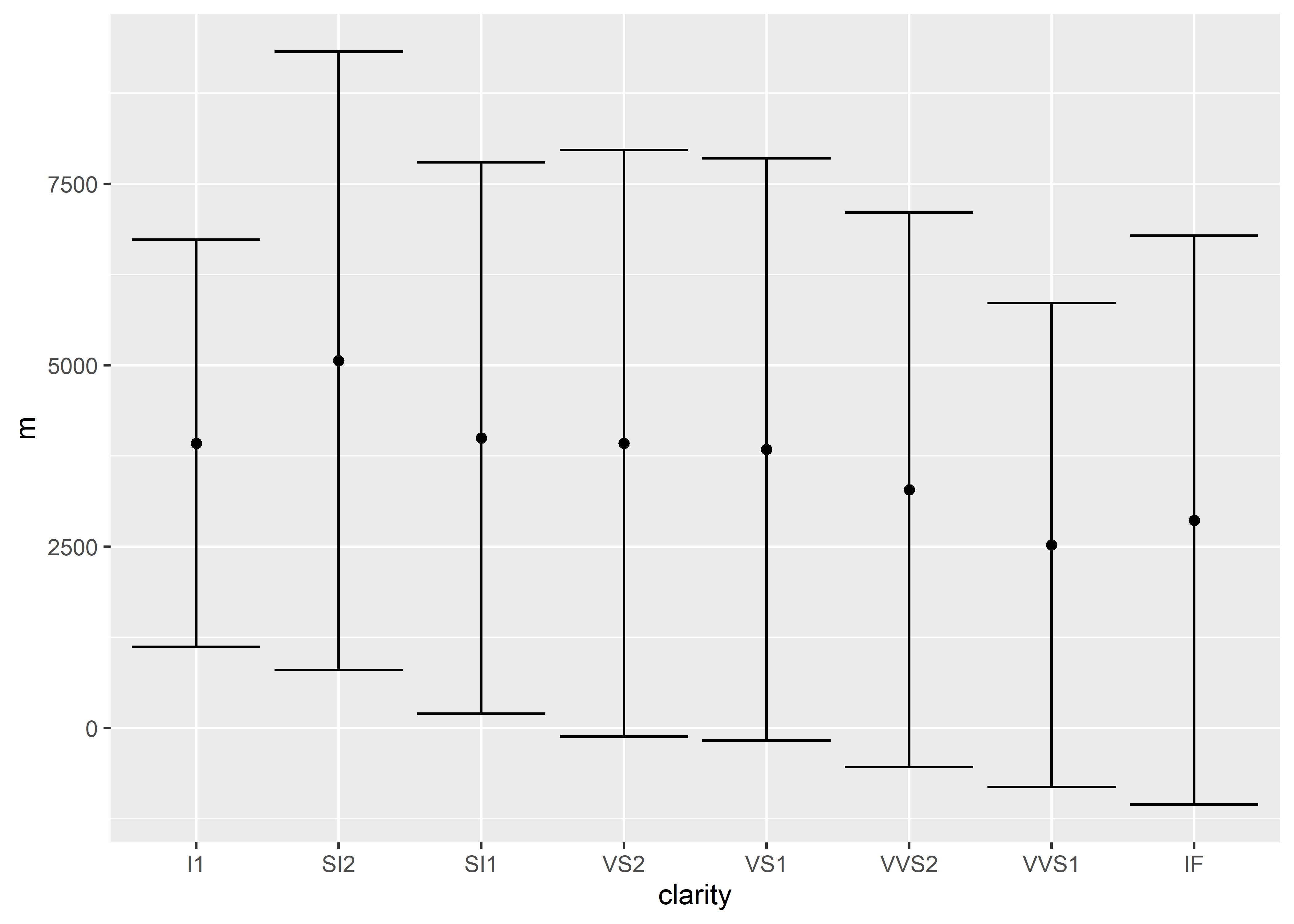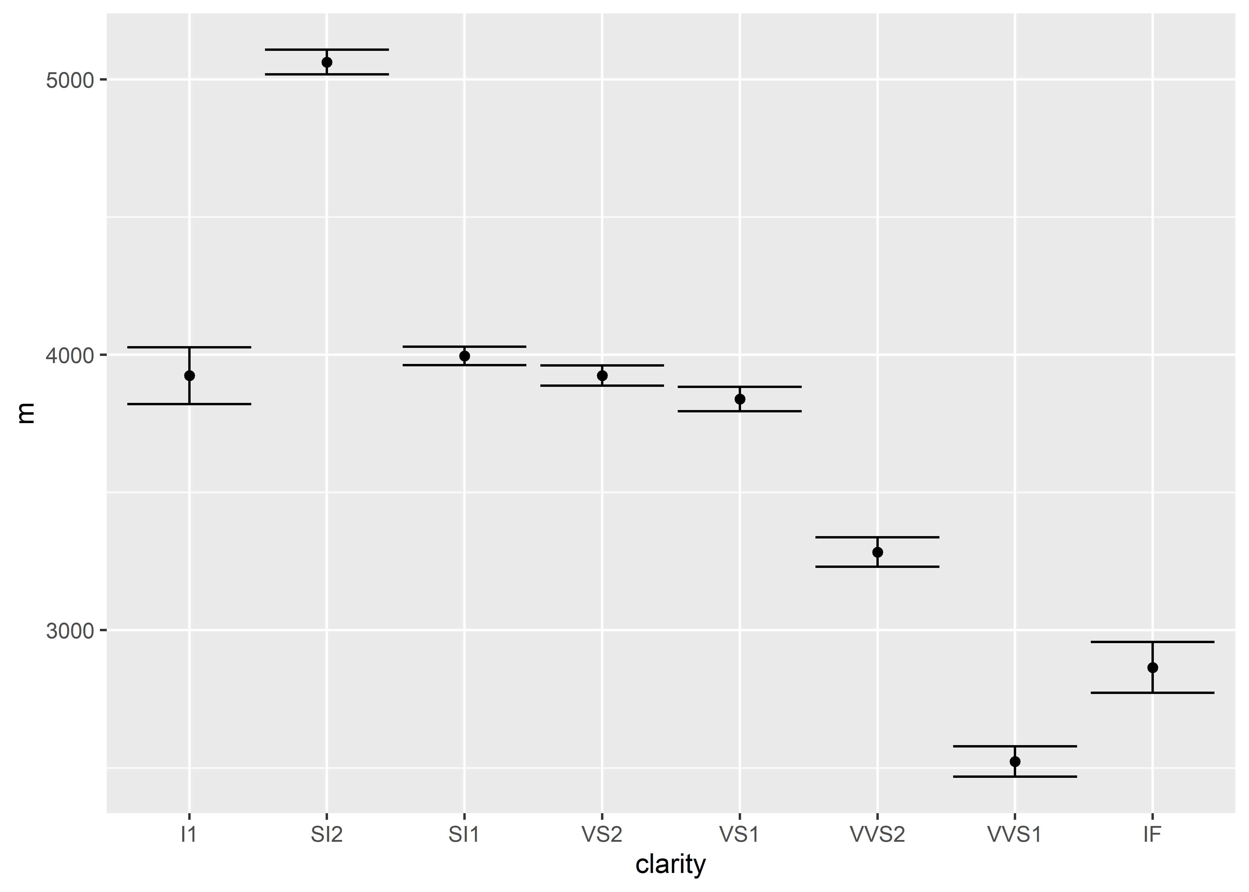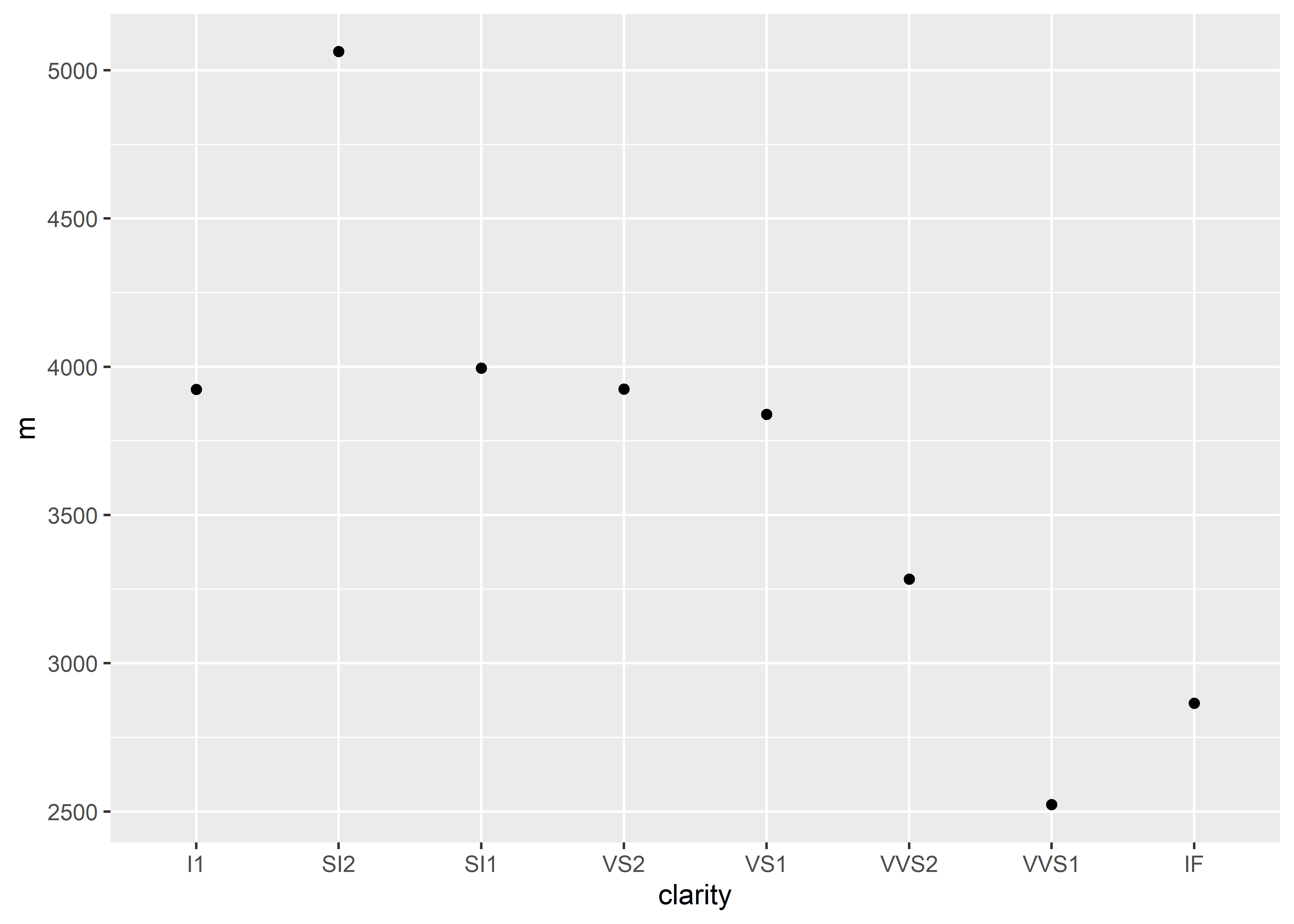 ggplot(aes(x = clarity, y = m)) + # setting up x and y values for graphing