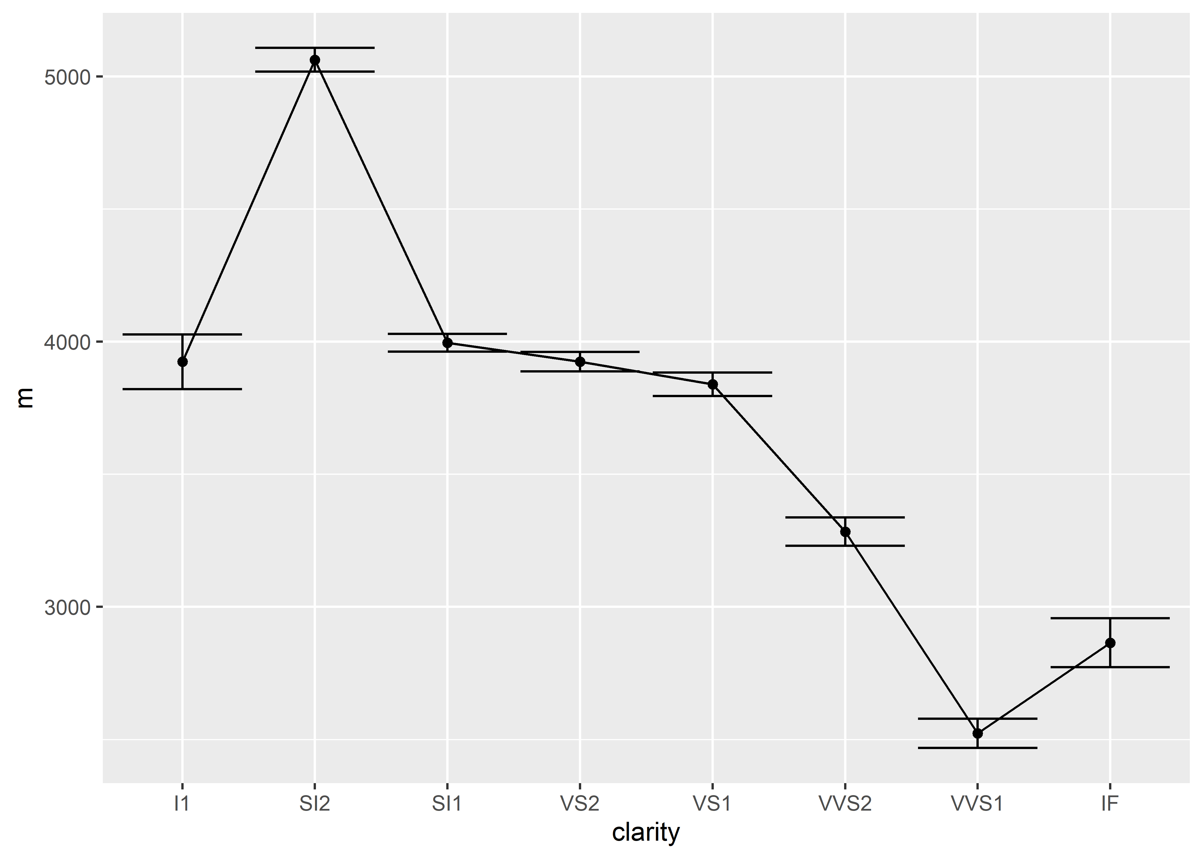 ggplot(aes(x = clarity, y = m, group = 1)) +