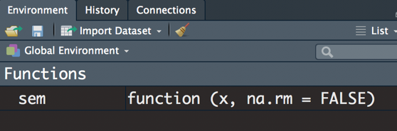 In order to add error bars that represent the standard error of the mean (SEM), we must first use a self-defined function. R does not currently have an accessible, built-in function at the time of writing this guide, so in order to use calculate the SEM, you must execute the following code (type this out in your script):