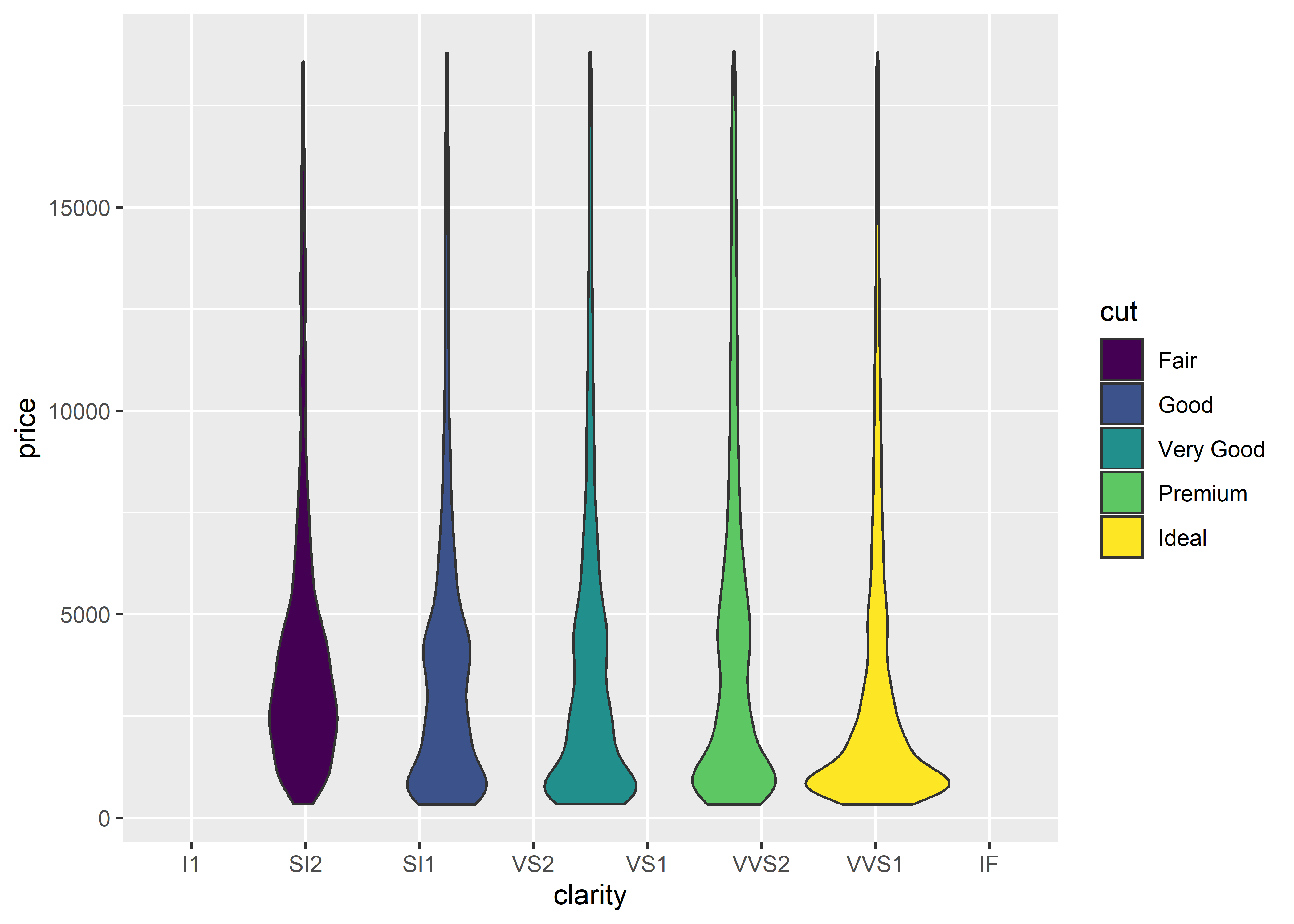 ggplot(aes(x = clarity, y = price, group = cut, fill = cut)) +