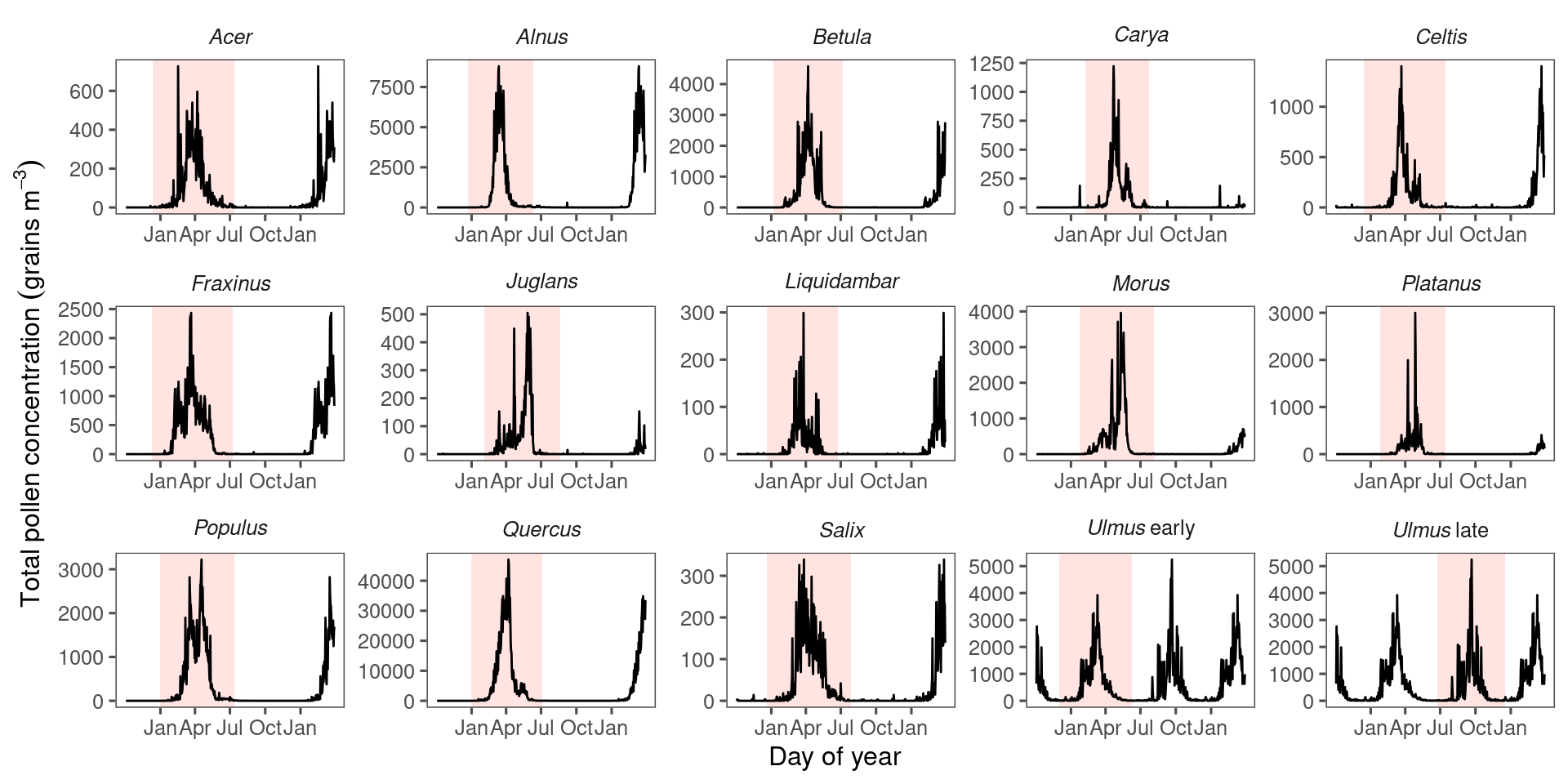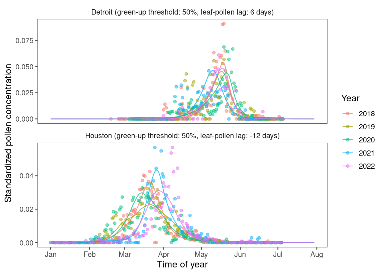 Estimate genus-specific pollen seasons by fitting Gaussian kernels.