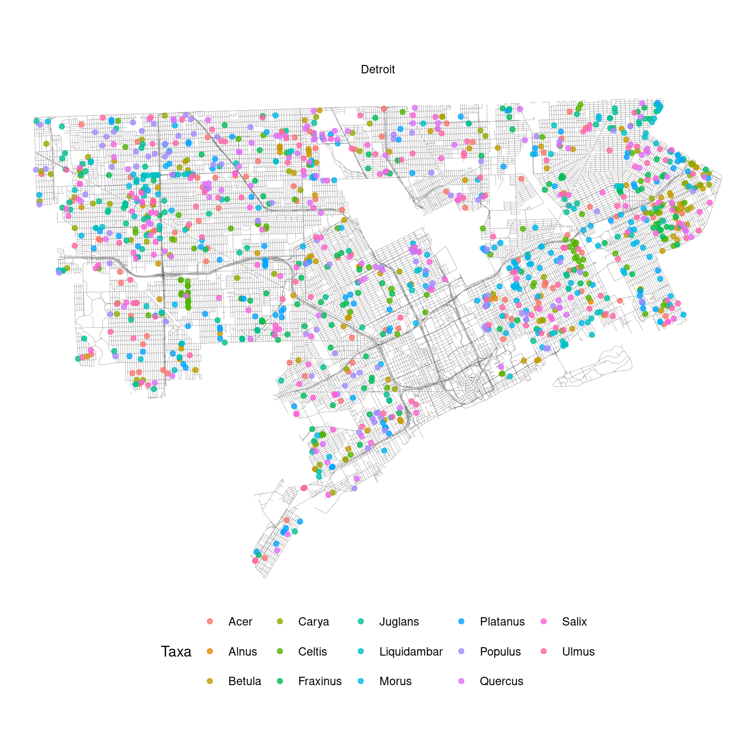 Here we visualize a subset of street trees in Detroit overlayed on a true-color PlanetScope image on May 8, 2017.