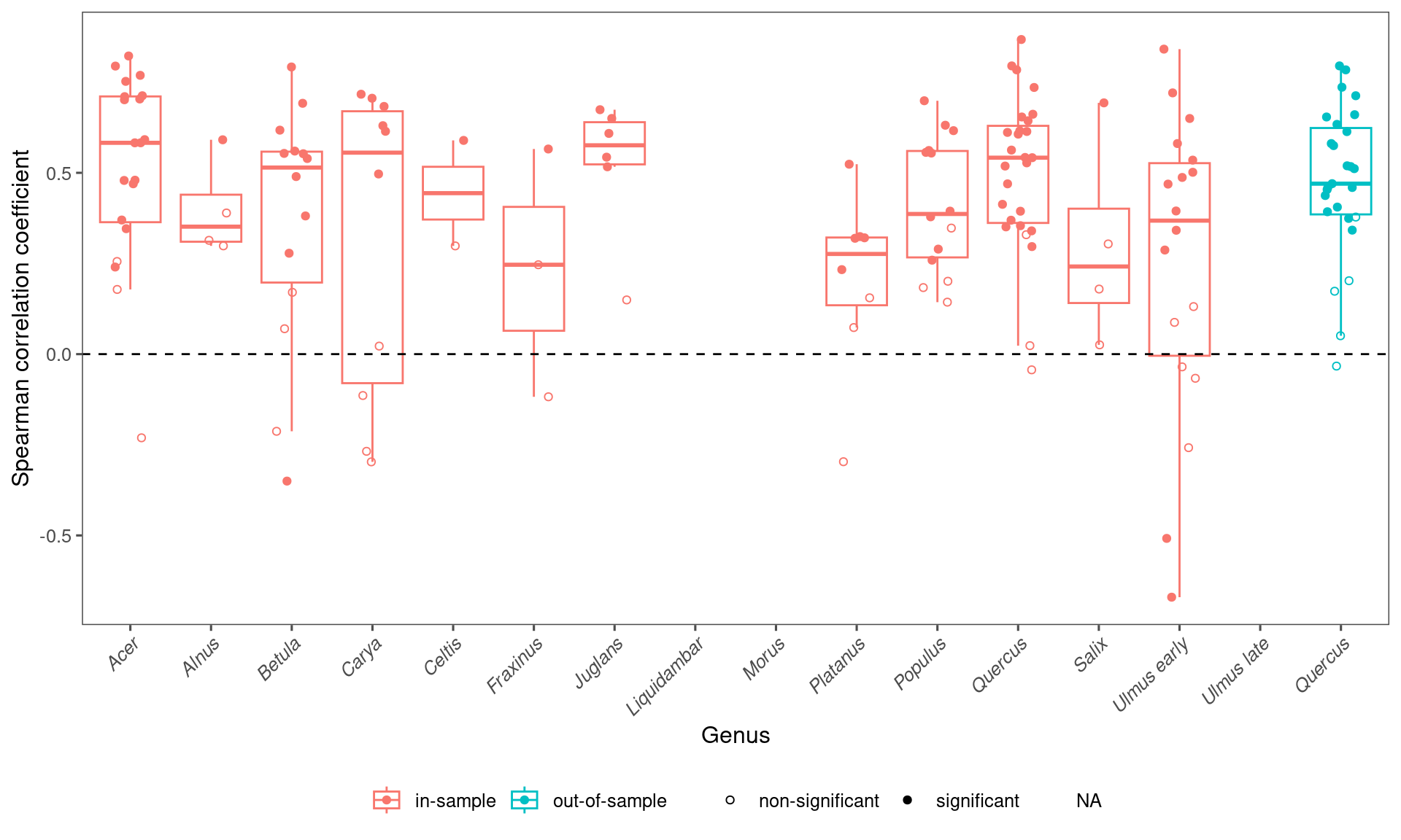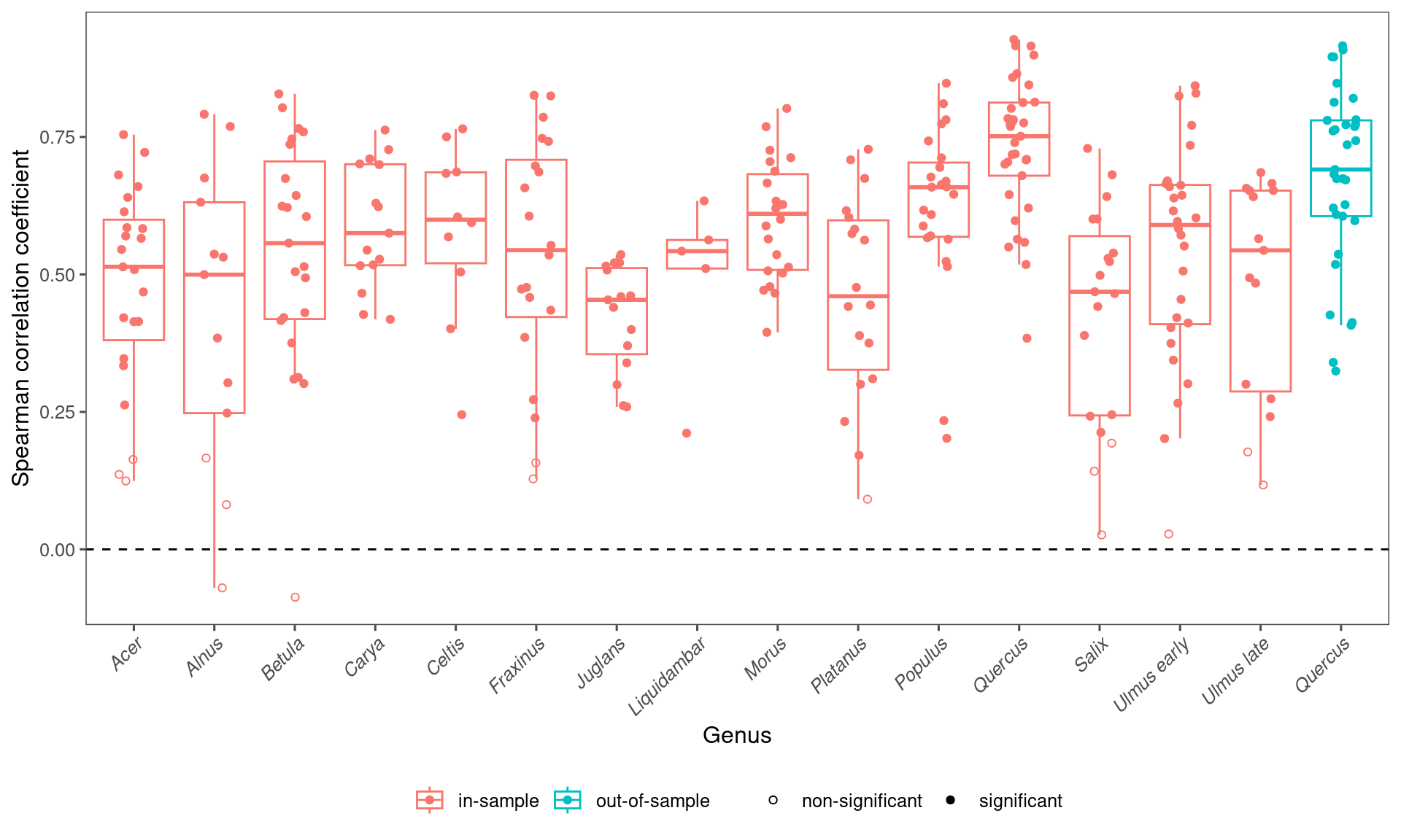 Figure 3.3: Comparing remotely-sensed pollen phenology from PlanetScope and site-level pollen phenology from aerial sampling. (A) Pollen phenology inferred from remotely-sensed leafing phenology tuned to the optimal green-up/down thresholds and leafing-pollen lags (lines) compared to pollen phenology inferred from airborne pollen concentration (points). Pollen phenology from both data sources was converted to probability density within each site year for comparison. Here we show examples of oak (Quercus spp.) pollen phenology at two sites on the south (Houston) and north (Detroit) of CONUS. (B) Accuracy of inferring pollen phenology across taxa measured with Spearman correlation coefficient, in-sample (fitting model with data from all sites) and out-of-sample (leave-one-out cross-validation).