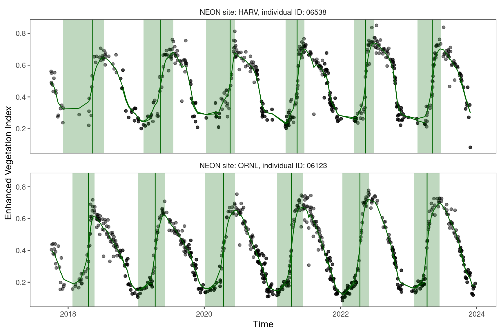 Read NEON phenometrics data prepared in the phenology-sample-data project.