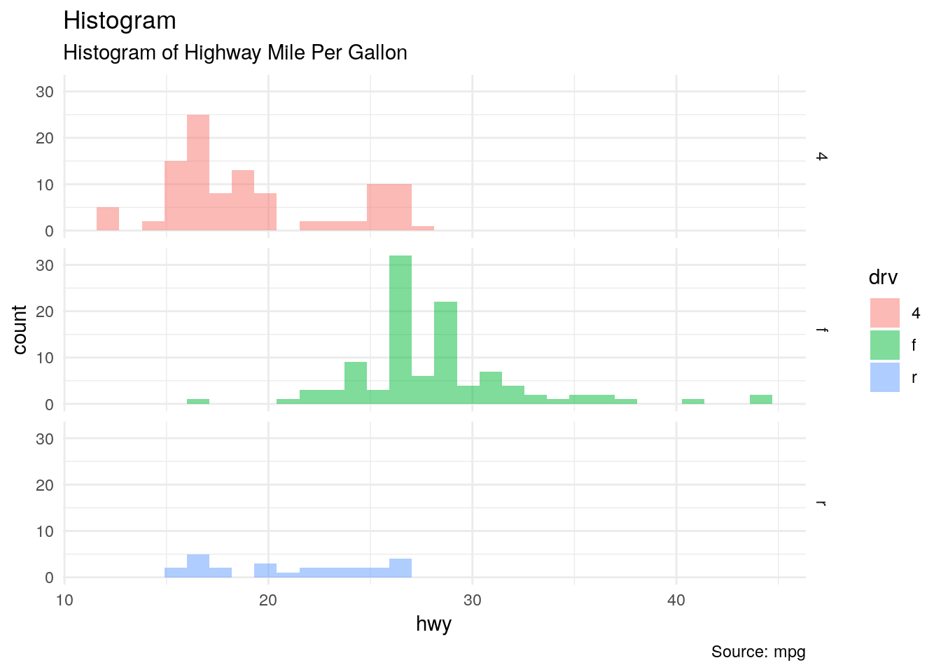 labs(title = "Histogram", subtitle = "Histogram of Highway Mile Per Gallon", caption = "Source: mpg") + facet_grid(rows = vars(drv)) + theme_minimal()## `stat_bin()` using `bins = 30`. Pick better value with `binwidth`.