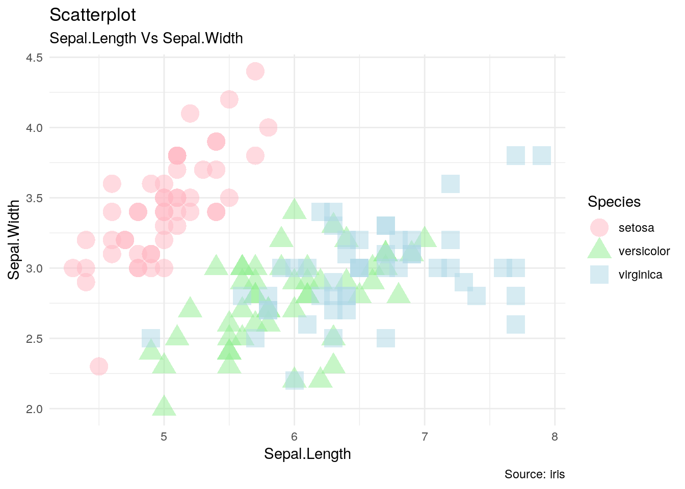 y = "Sepal.Width") + theme_minimal() + scale_color_manual(name = "Species", values = c("lightpink", "lightgreen", "lightblue"))