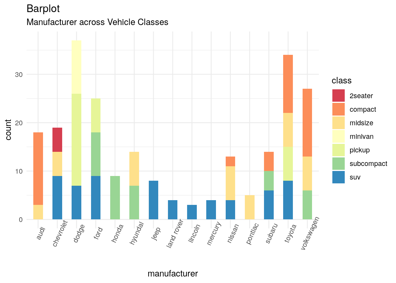 ggplot(data=mpg, aes(x=manufacturer)) +geom_bar(aes(fill=class),width=0.5)+scale_fill_brewer(palette="Spectral")+