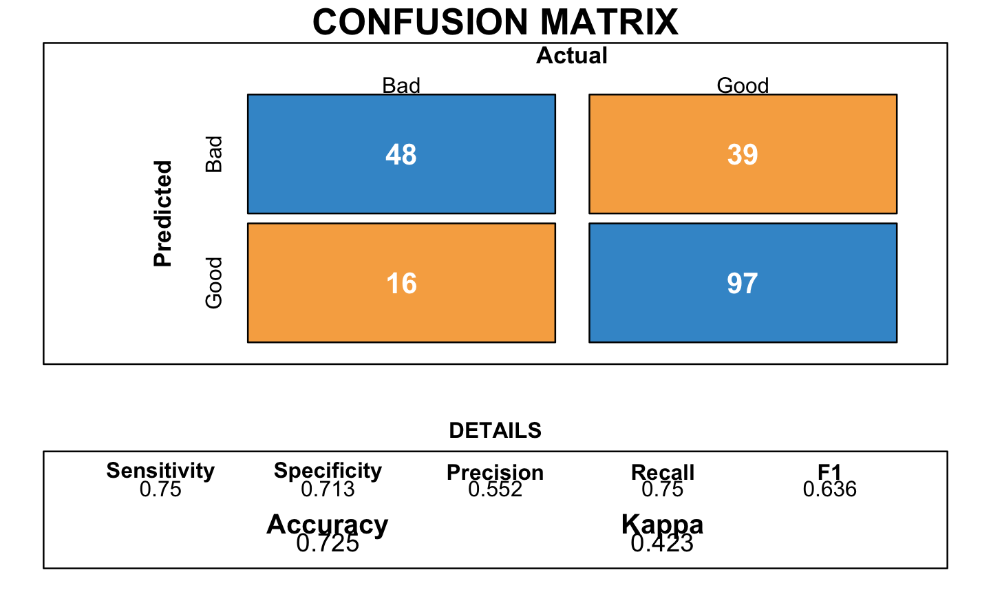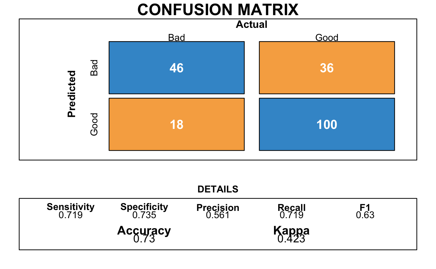 We did several confusion matrix to measure the performance. The first one was with the K-NNk method. We found an accuracy of 0.615 which corresponds to well predicted clients (good and bad). The best accuracy value is 1 so 0.615 is considered as an average value.