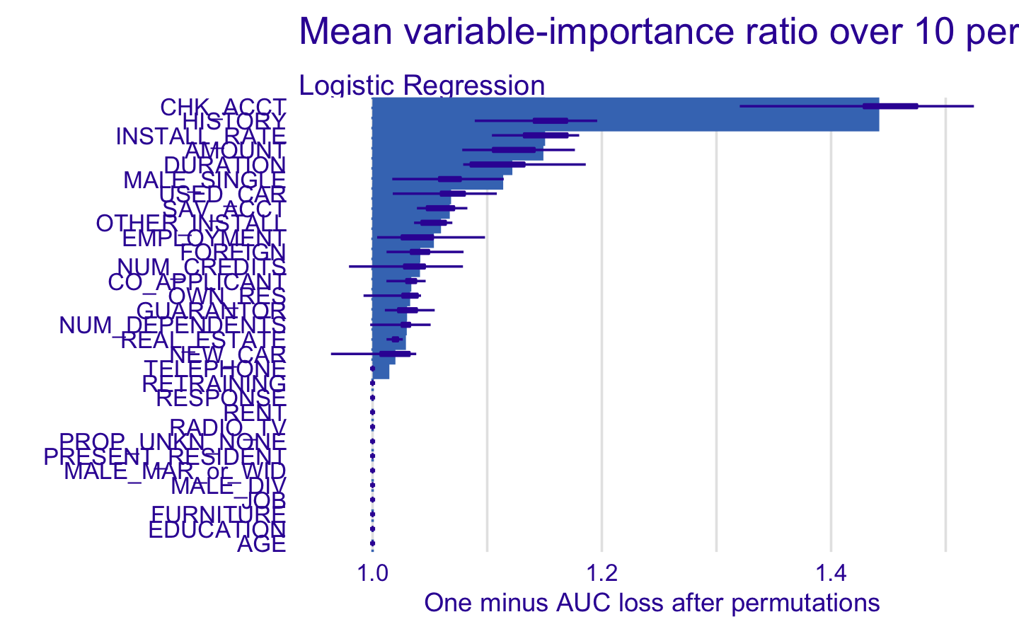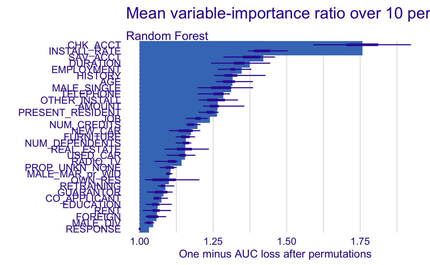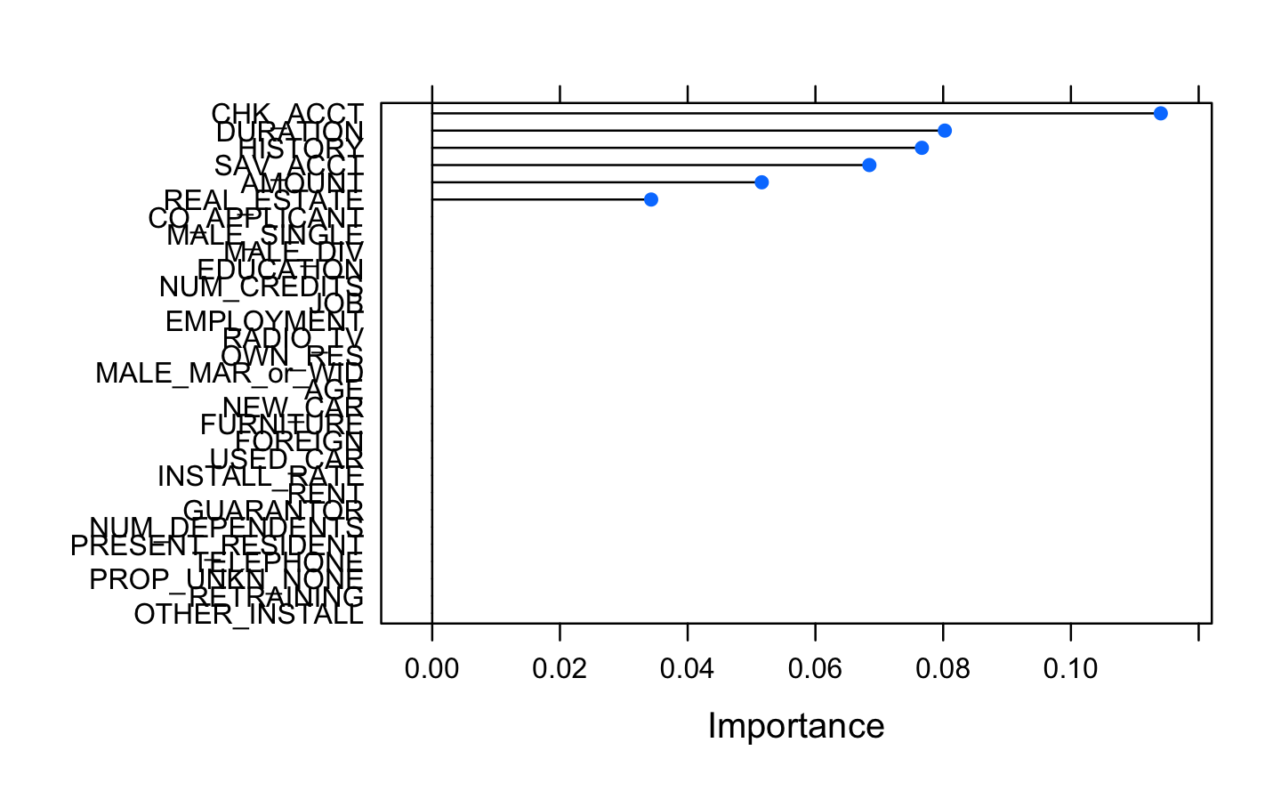 The result below displays that we seem to have 6 relevant variables: checking account, the duration of the credit asked, the history of previous credits, the savings, the amount of money owned by the applicant and the real estate owned.